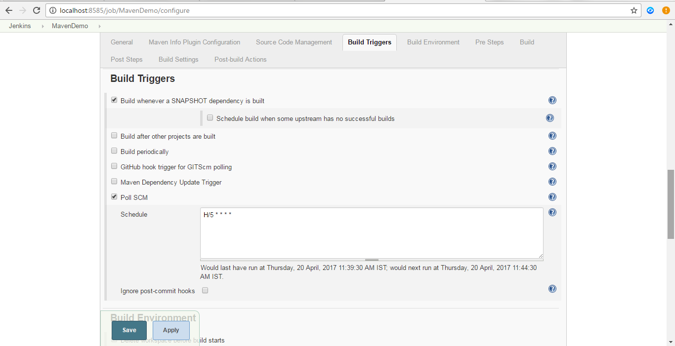 After that click on Build Triggers tab and select Poll SCM, then enter the appropriate value for polling(as schedular) to check for SVN commit. Value are in Crone expression format as below. specify scheduler. This will check the svn repository at specific interval or time and if there is any change in code, it immediately starts build.